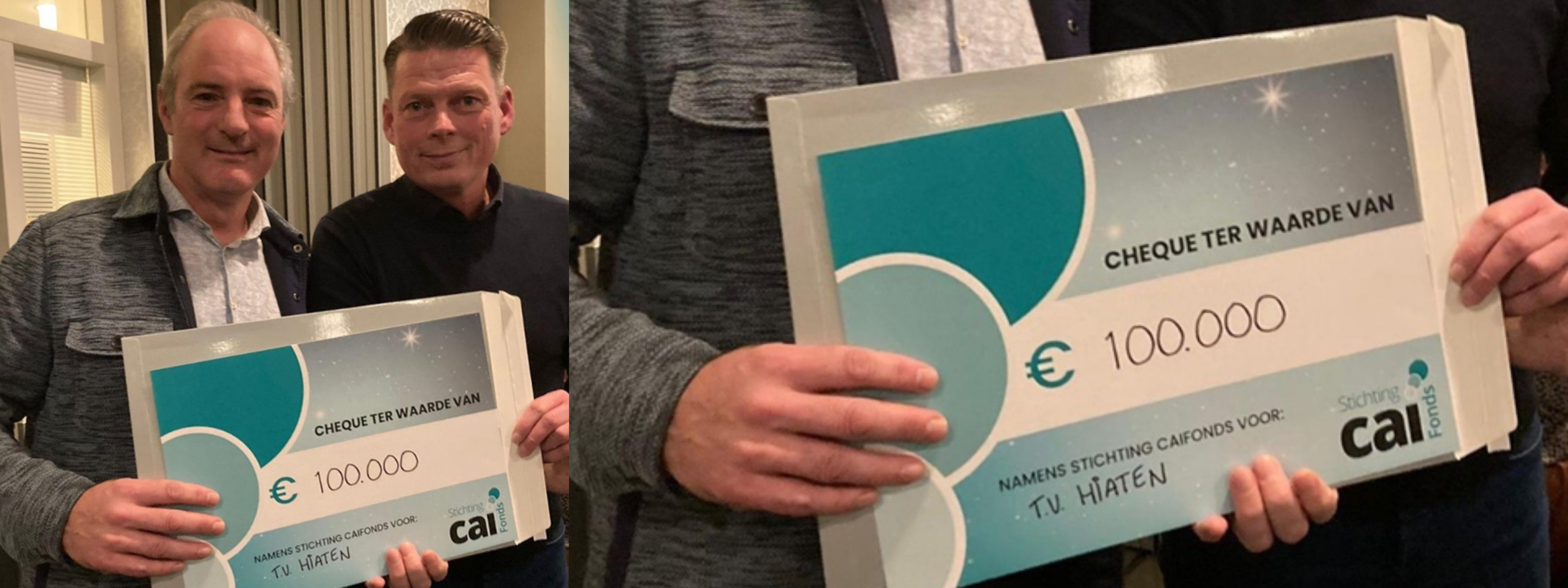 Op vrijdagavond 1 december hebben Chris Kruger en Jeroen Beerentemfel uit handen van voorzitter Ruud Vat een cheque in ontvangst mogen nemen van € 100.000,-. Een geweldig bedrag waar we als Hiaten zeer dankbaar voor zijn!