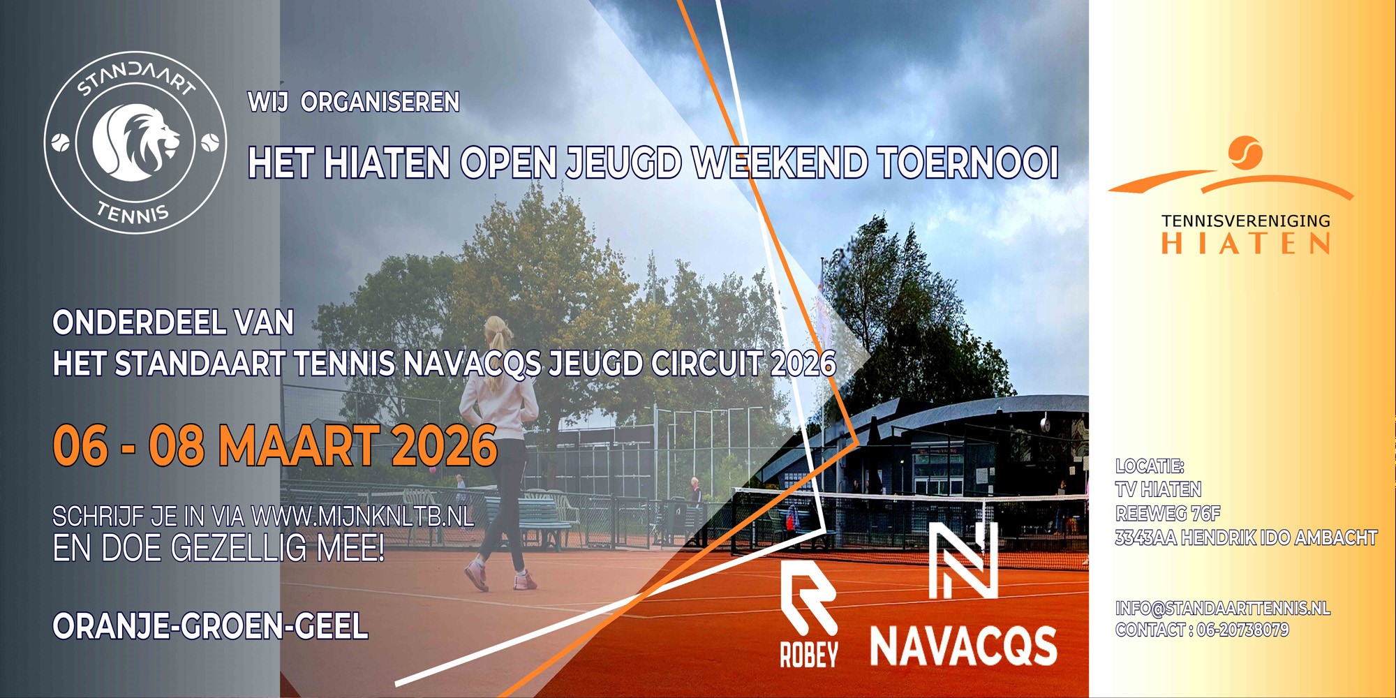 Dit tennisweekend maakt deel uit van het Standaart Tennis Navacqs Jeugd Circuit 2026. Tijdens dit unieke tennisevenement komen jonge talenten gedurende heel het seizoen in actie. In toernooien bij verschillende tennisverenigingen wordt gestreden om punten, plezier én prestige. Kortom, het Hiaten Open Jeugd Weekend Toernooi biedt jonge tennissers een mooie kans om wedstrijden te spelen tegen leeftijdgenoten, ervaring op te doen én vooral veel plezier te hebben op (en naast) de baan.