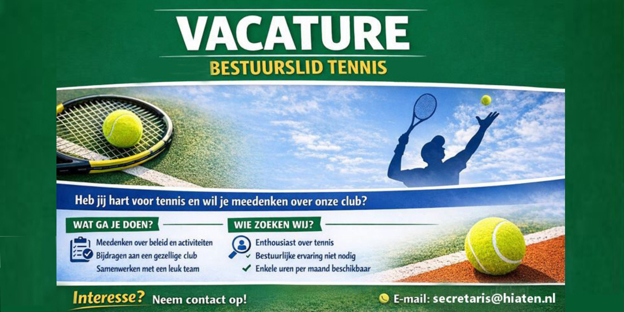 Door het vertrek van Elise Bijlsma, die jarenlang een zeer waardevolle bijdrage leverde, is er bij Hiaten een vacature Bestuurslid Tennis ontstaan. Wil jij een bijdrage leveren aan het georganiseerde tennis binnen onze vereniging? Wij zijn op zoek naar een enthousiaste vrijwilliger die het bestuur komt versterken.