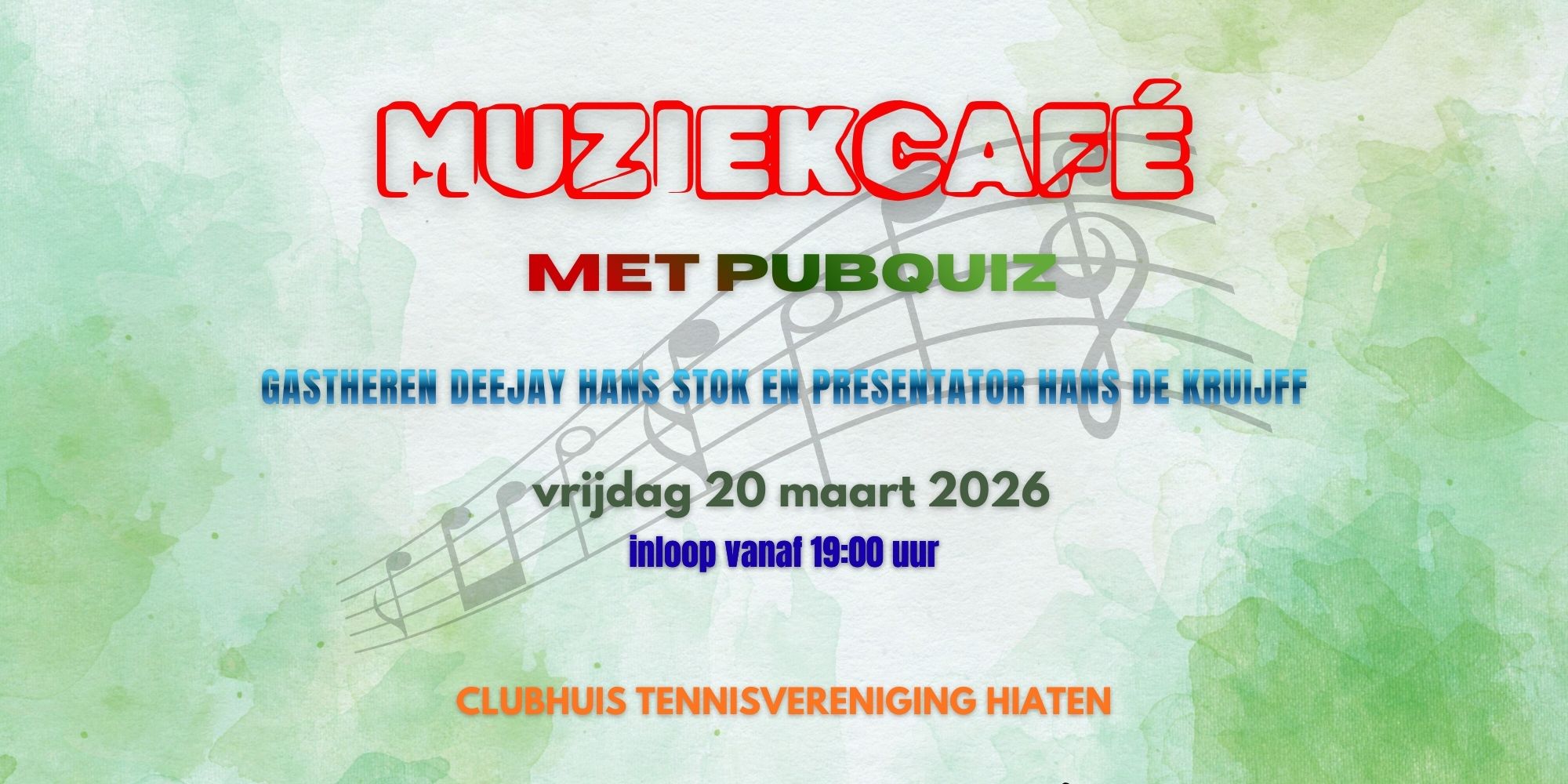 Wie heeft er nou geen zin in een gezellig avondje muziek luisteren, meezingen, een dansje en tevens vragen beantwoorden over de meest uiteenlopende (muziek)onderwerpen? Of het nou gaat over het herkennen van muziekintro’s of over de hoofdstad van Colombia, alles komt voorbij tijdens het Muziekcafé, dat op vrijdag 20 maart weer bij Hiaten wordt gehouden.